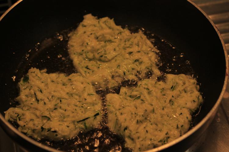 5. Reichlich Öl erhitzen und Kartoffel- bzw. Zucchiniteig portionsweise hineingeben. Die Puffer sollten schwimmen.