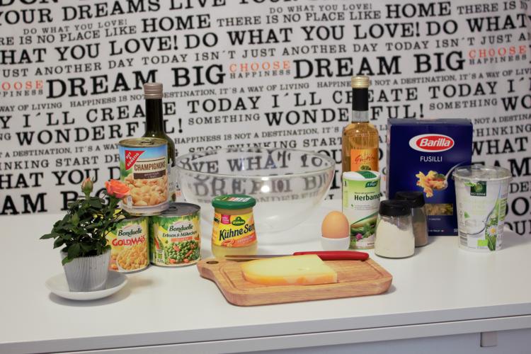 Für den Nudelsalat die gekochten Nudeln, das kleingeschnittene Gemüse und den Käse in einer großen Schüssel vermengen. Mit Kräutersalz, Pfeffer und Paprikapulver abschmecken.