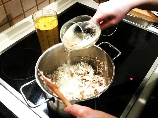 Wenn auch der Reis glasig gedünstet ist, kann man den Weißwein eingießen. Immer schön umrühren, bis der Reis den Weißwein komplett aufgenommen hat, also keine Flüssigkeit mehr im Topf ist. Dann anfangen, ca. 100ml der Gemüsebrühe aufzugießen und umrühren, bis keine Flüssigkeit mehr im Topf ist. So weitermachen, bis keine Brühe mehr da ist. Den Biss-Test machen: Ist der Reis noch bissfest, muss noch Brühe ran, wenn er schon schön weich und cremig ist, passt er!