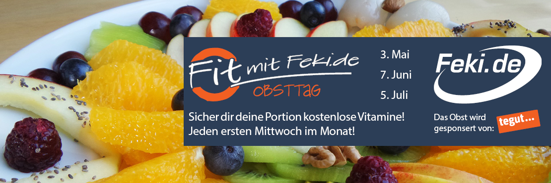 Es ist wieder so weit! Der zweite Feki.de Obsttag in diesem Semester steht an. Auch im Frühling können ein paar Vitamine nicht schaden, also schnappt euch im Vorbeigehen Äpfel, Bananen und Co.!